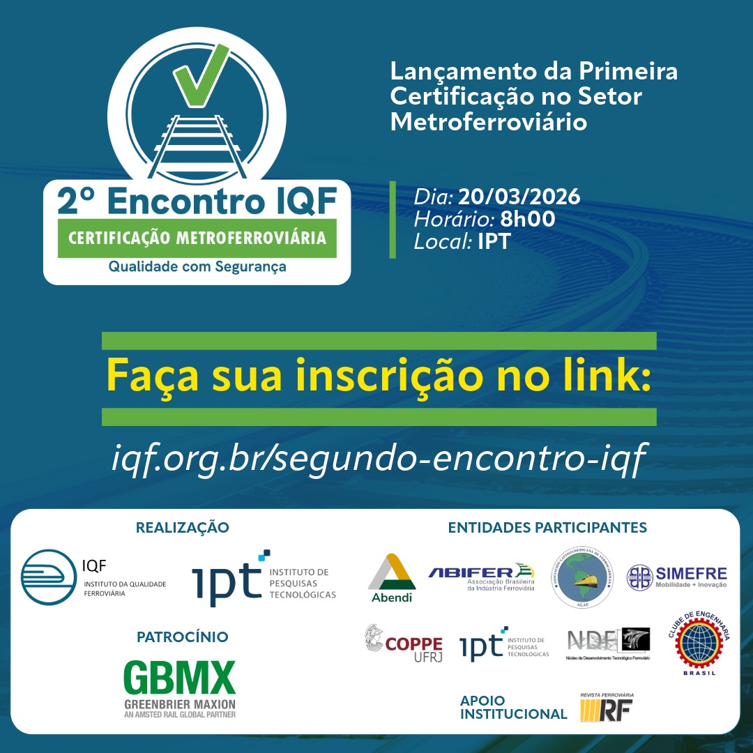 Estão abertas as inscrições para o 2º Encontro IQF, que acontece em 20 de março de 2026, no Instituto de Pesquisas Tecnológicas (IPT), em São Paulo. O evento reunirá especialistas, lideranças institucionais e representantes de diferentes segmentos para discutir certificação, qualidade e segurança no transporte metroferroviário brasileiro.