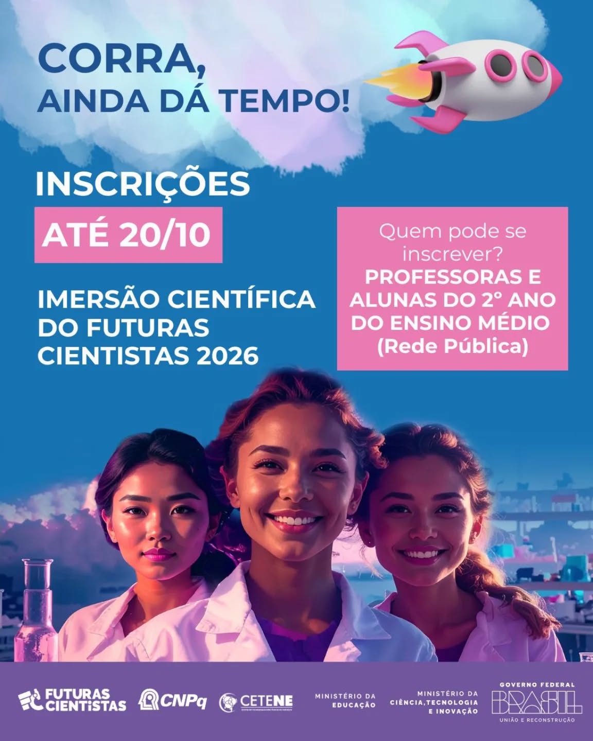 As inscrições devem ser feitas pela plataforma: https://www.futurascientistas.com.br/