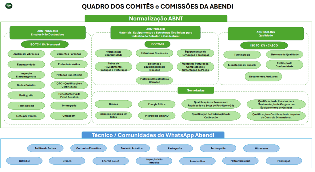 A Abendi atua como Organismo de Normalização Setorial da ABNT (ONS-058), coordenando o desenvolvimento das normas de END no Brasil por meio das Comissões de Estudo. É nesse espaço que especialistas, empresas e instituições transformam demandas reais do segmento em critérios técnicos compartilhados.