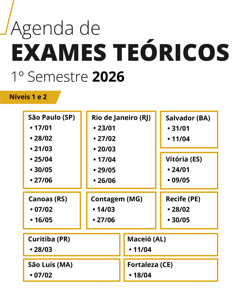 Em 2026, os exames teóricos de certificação Níveis 1 e 2 acontecem entre janeiro e junho, com aplicações em diferentes regiões do país: